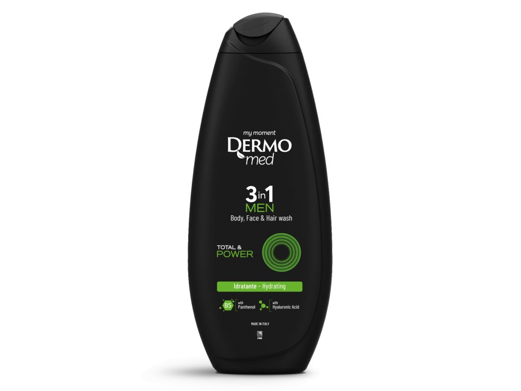 DERMOMED 3v1 MEN Total & Power je univerzálny umývací gél na telo, tvár aj vlasy. Osviežujúce a hydratačné zloženie s panthenolom a kyselinou hyalurónovou je ideálne na každodenné použitie.